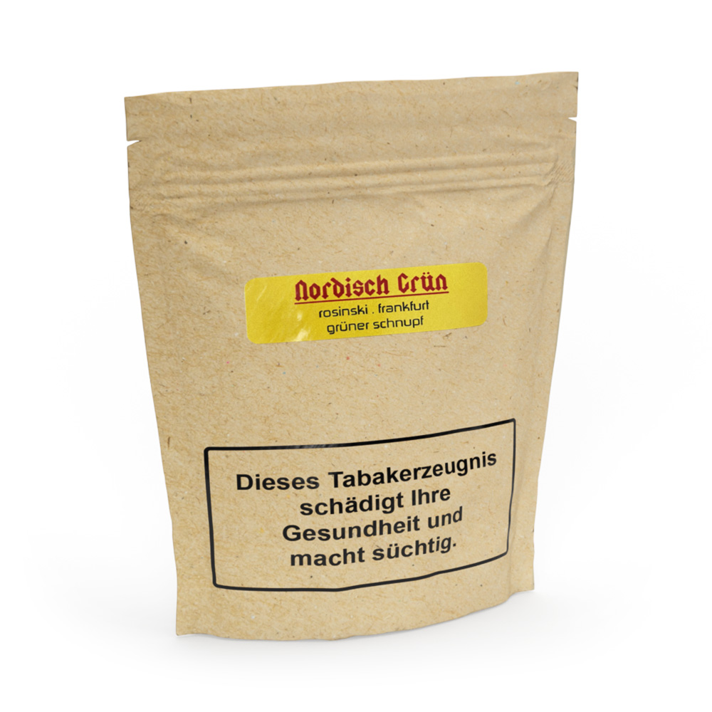 Der Rosinski Nordisch Grün Schnupftabak besteht aus jungem grünen Tabak und einer leichten Mentholnote. Geliefert wird der Rosinski Nordisch Grün in einer Tüte mit 10 Gramm Inhalt.