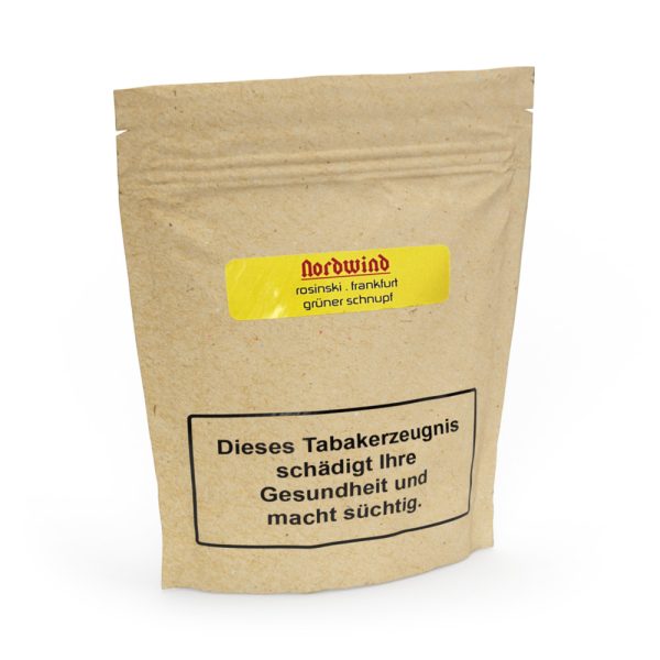 Der Rosinski Nordwind Schnupftabak besteht aus grünem Tabak mit einer Prise Kampfer, Lorbeer und einer leichten Mentholnote. Geliefert wird der Rosinski Nordwind in einer Tüte mit 10 Gramm Inhalt.