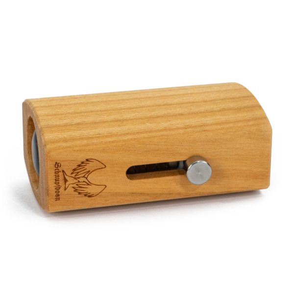 Die aus Kirschholz gefertigte Schnupftabakdose der Marke Schnupfdosn verbindet traditionelles bayrisches Handwerk mit moderner Funktionalität. Jede Dose zeichnet sich durch ihre warme und feine Maserung aus, die in einer spezialisierten Werkstatt handgefertigt wird. Das eloxierte Aluminium des Dosierkolbens sorgt für eine präzise Tabakentnahme, während die anderen Komponenten wie die Federstahl-Spannfeder und der Edelstahl-Bedienhebel zur Robustheit und Langlebigkeit beitragen. Zusätzlich kann diese Schnupftabakdose auch als Schnupfmaschine verwendet werden.