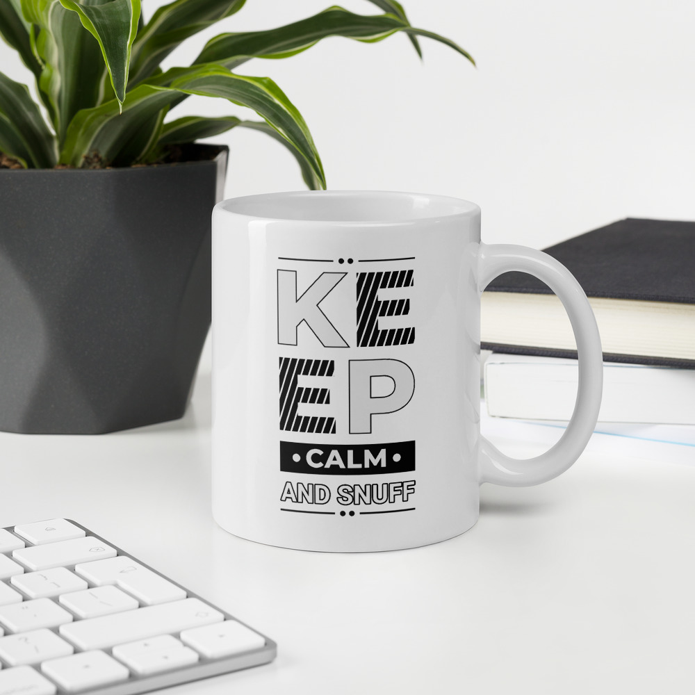 Die Snuffland Tasse „Keep Calm and Snuff“ ist eine robuste Tasse und ist perfekt für deinen Kaffee am Morgen, Nachmittagstee oder jedes andere heiße Getränk. Die Tasse ist glänzend weiß und die lebhaften Drucke bewahren ihre Qualität auch beim Spülen oder in der Mikrowelle.