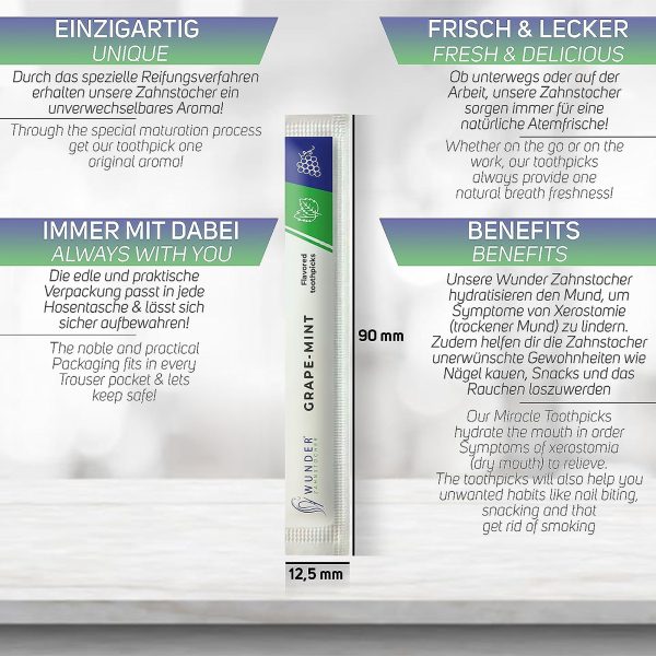 Lassen Sie sich von der verführerischen Kombination aus saftiger Traube und kühler Minze mit den Wunder-Zahnstochern im Traube/Minze-Aroma begeistern. Jeder einzelne Zahnstocher ist eine Explosion von süßer Fruchtigkeit und erfrischender Kühle, die perfekte Ergänzung nach dem Essen oder für eine kurze aromatische Pause zwischendurch.